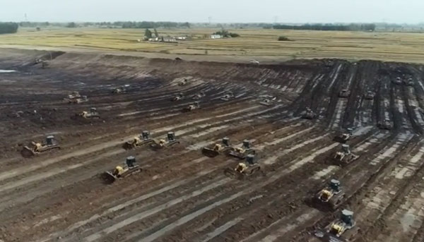 山東某河道施工工地,使用近10臺山推推土機進行土方作業(yè)。