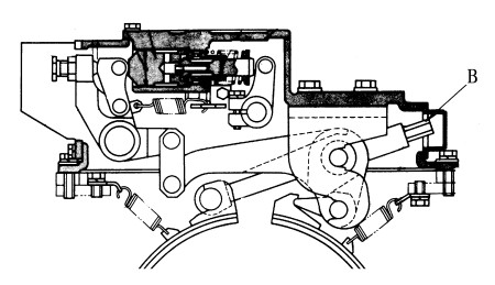 2)用90Nm的力矩,擰緊調(diào)整螺母(B)使制動(dòng)帶緊緊抱住制動(dòng)鼓。