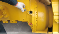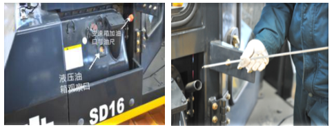 檢查工作油箱油位注意:熄火后整機處于平坦地面,鏟刀、松土器落下后,油位處于中位時為正常。