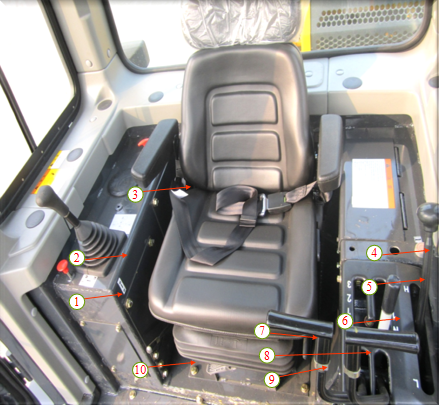 鏟刀鎖緊 2、鏟刀操縱 3、熄火拉線 4手油門操縱桿 5喇叭按鈕
